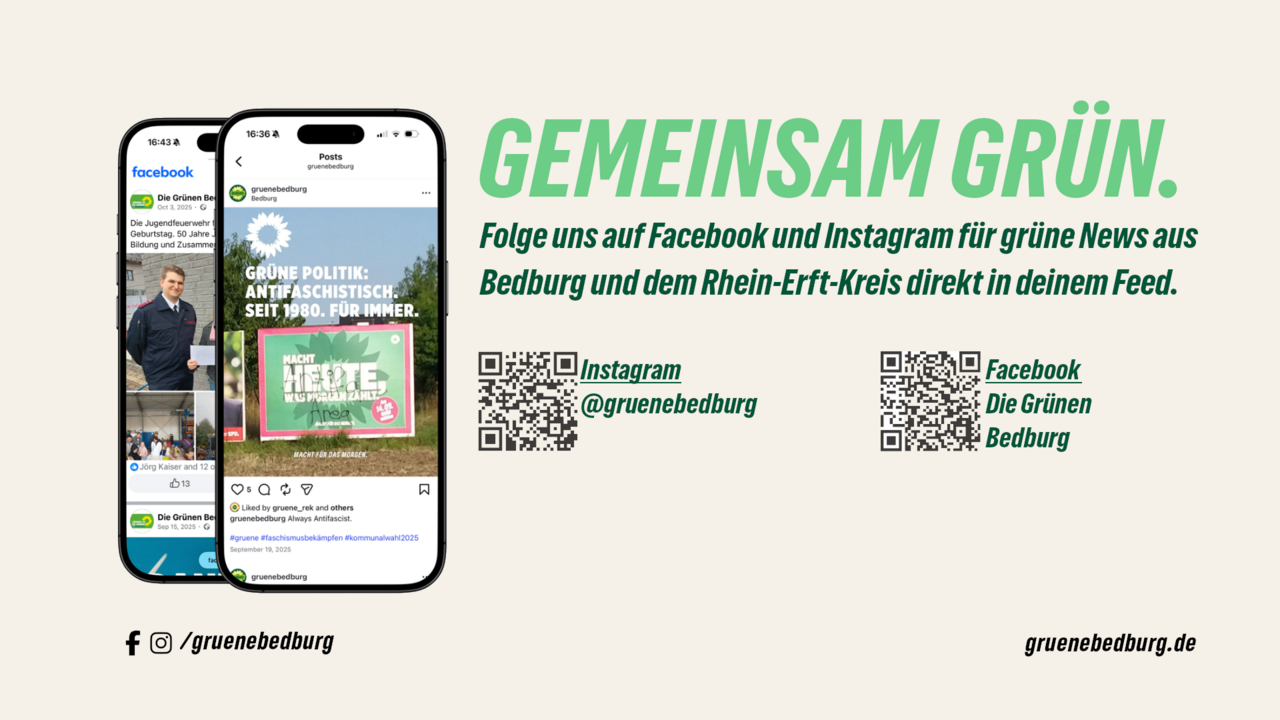 Politik lebt vom Dialog. Auf Facebook und Instagram teilen wir Neuigkeiten, Termine und Einblicke in unsere Arbeit für ein nachhaltiges und lebenswertes Bedburg. Getreu dem Motto "Gemeinsam Grün" freuen wir uns, wenn du uns dort folgst!