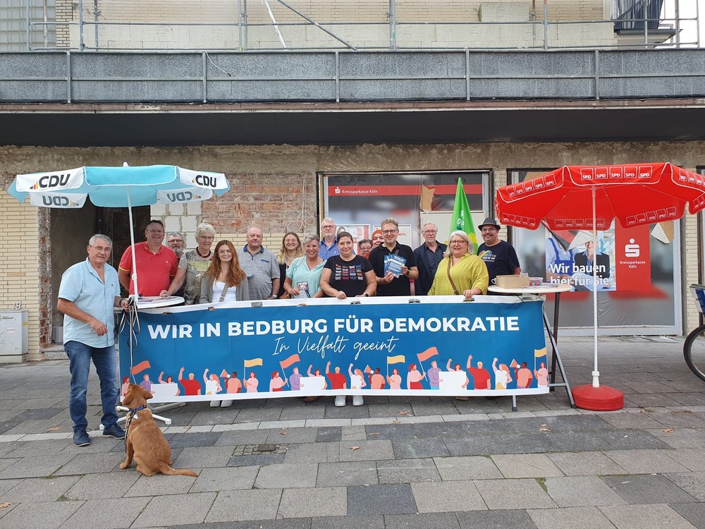 Wir kamen mit den Bedburgerinnen und Bedburgern über die aktuellen Herausforderungen und die Poltik vor Ort ins Gespräch. Außerdem wurde ein gemeinsamer Infoflyer mit Kontaktdaten von allen Parteien sowie einer gemeinsamen Erklärung für Demokratie und gegen jegliche Art von Extremismus verteilt.